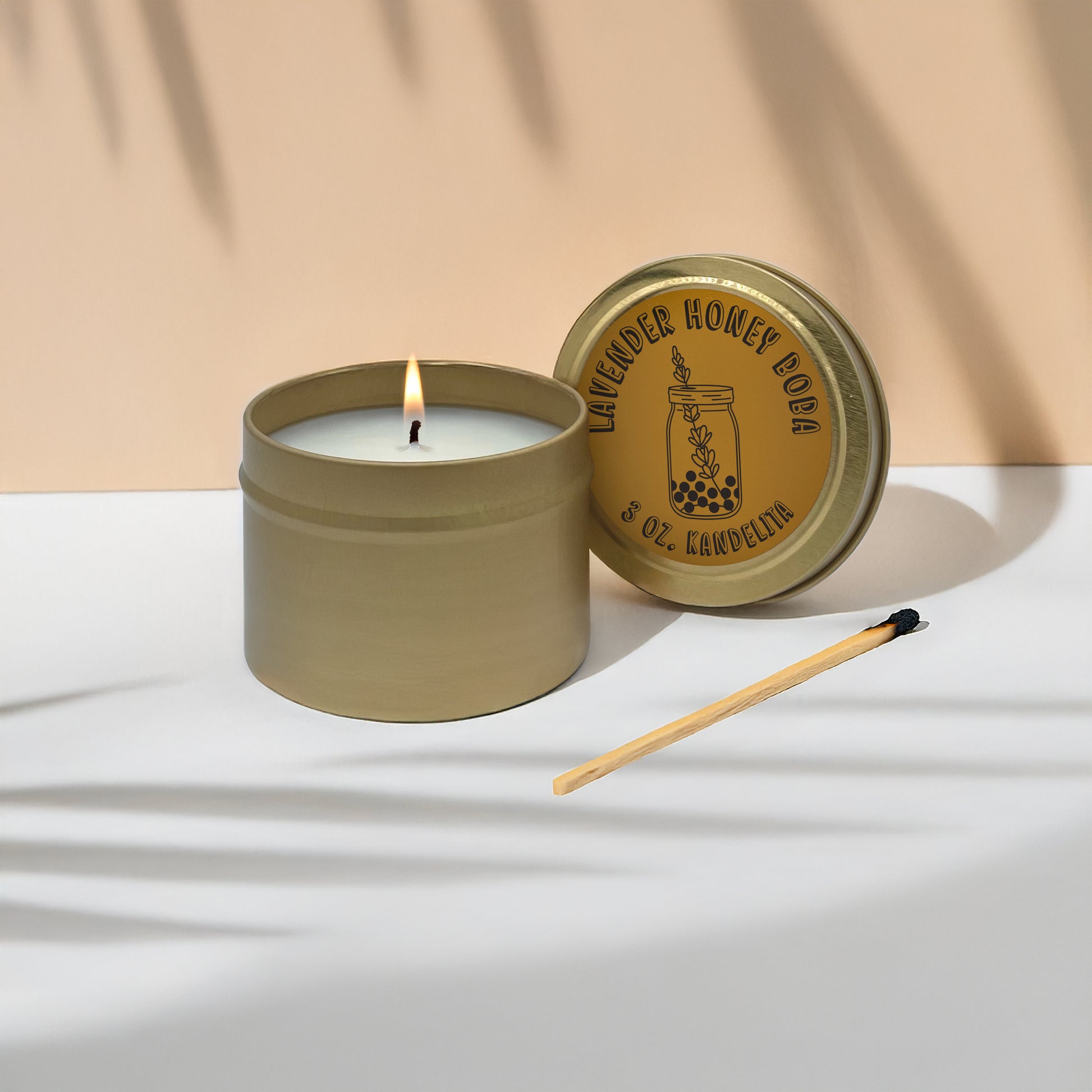 Perfect as a travel candle, sampler, or gift, housed in a sleek gold-colored metal tin.