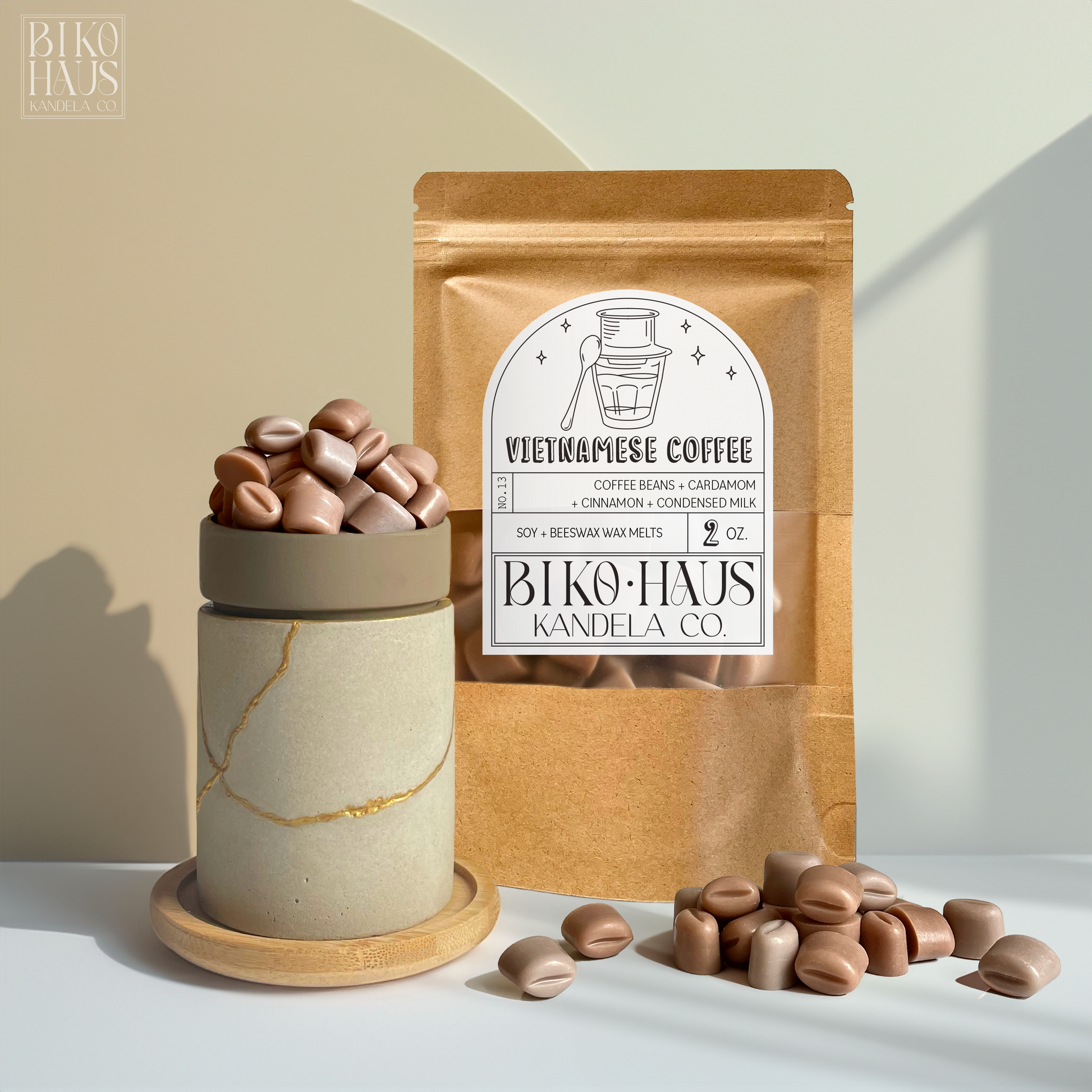 Wake up to the rich scent of Vietnamese Coffee scented wax melts. Our special morning blend of freshly brewed dark roast coffee is infused with the comforting warmth of cardamom and cinnamon, with just a touch of sweet condensed milk. Our tiny coffee bean-shaped wax melts are packed with the rich aroma of Vietnamese cà phê, inspired by the bustling coffee culture hub of Hanoi.